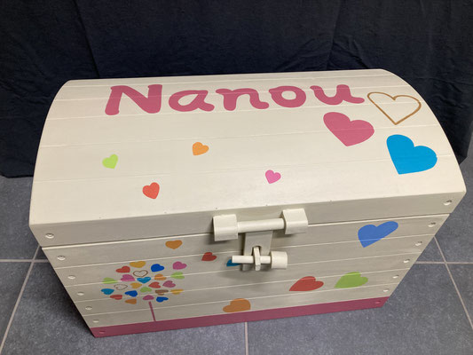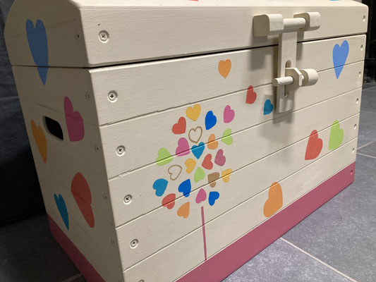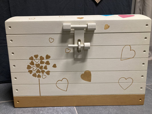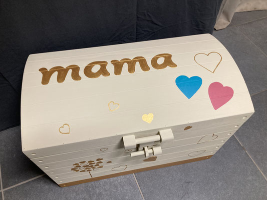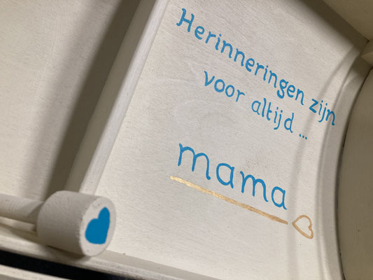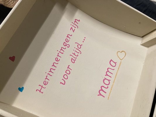 Beide kinderen hebben hun eigen koesterkoffer met herinneringen die hun mama voor hen heeft bewaard in deze koffers. Het tekstje heeft ze zelf gekozen, zo is ze toch altijd met haar kinderen verbonden.