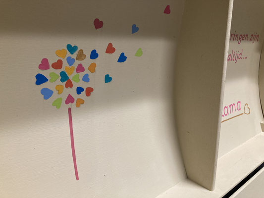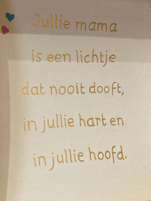 Het pluisje op de koesterkoffer werd ook gekozen voor het rouwkaartje. De koffer is goud beschilderd omdat ze voor haar kinderen een engel zal zijn. De 2 gekleurde hartjes zijn haar kinderen, die beide een koesterkoffer kregen voor zichzelf. In de koffer van de mama zitten herinneringen van haar als opgroeiend kind tot de herinneringen als jonge mama.
